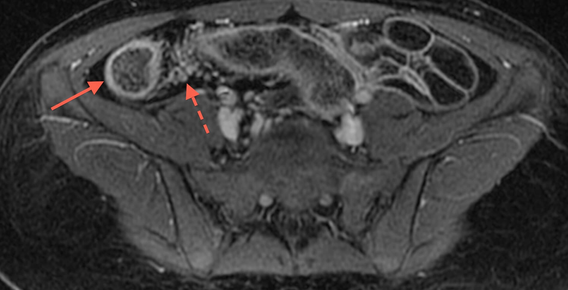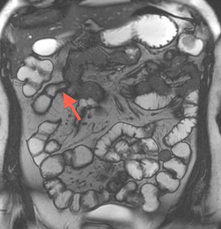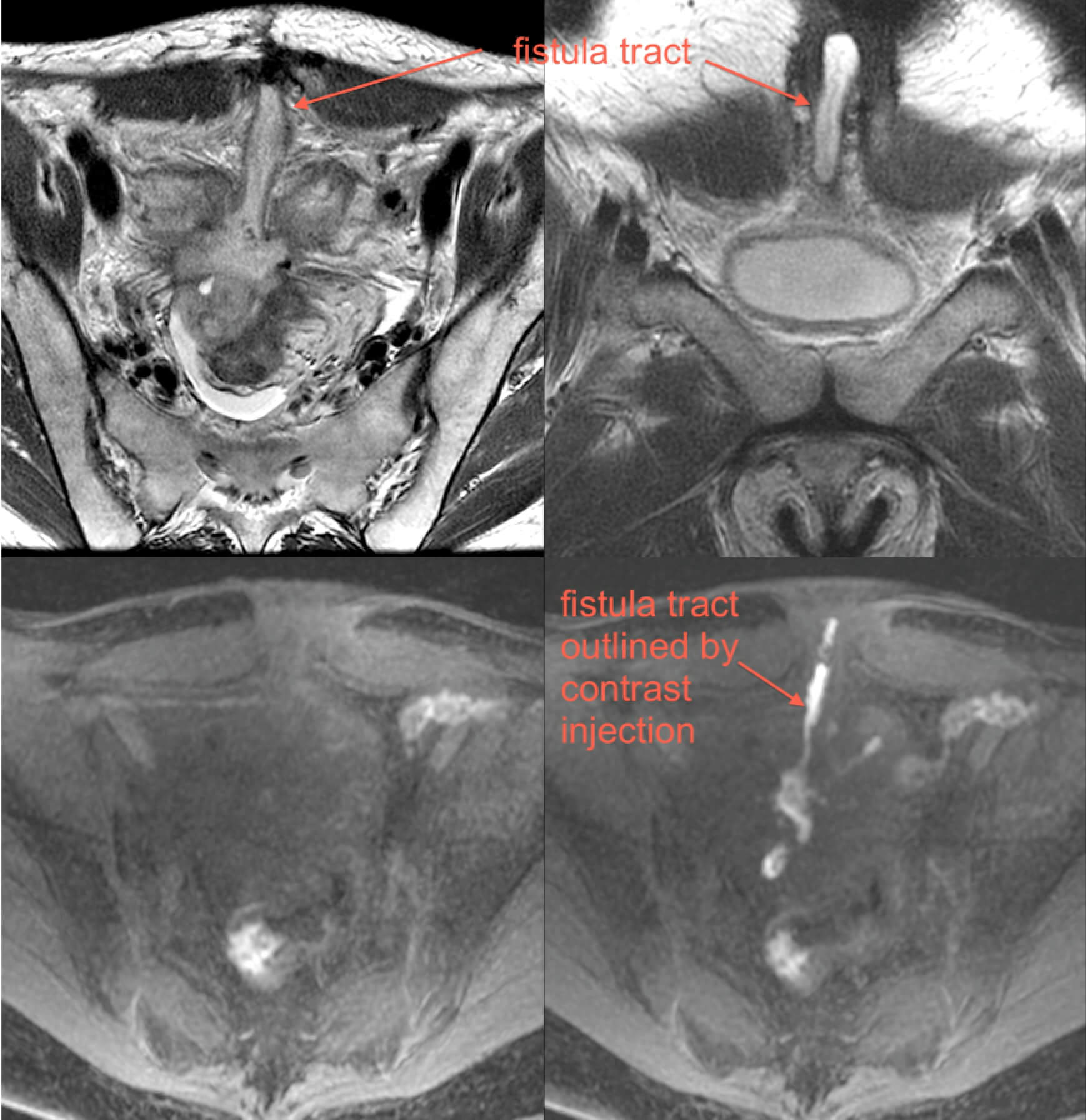 MR enterography is valuable for determining extent of inflamed bowel, discriminating between active inflammation and chronic fibrosing disease, detecting fistulae, and detecting strictures. Additionally, MRI can provide excellent delineation of the course of perianal fistulas, including relationships to sphincters and levators.